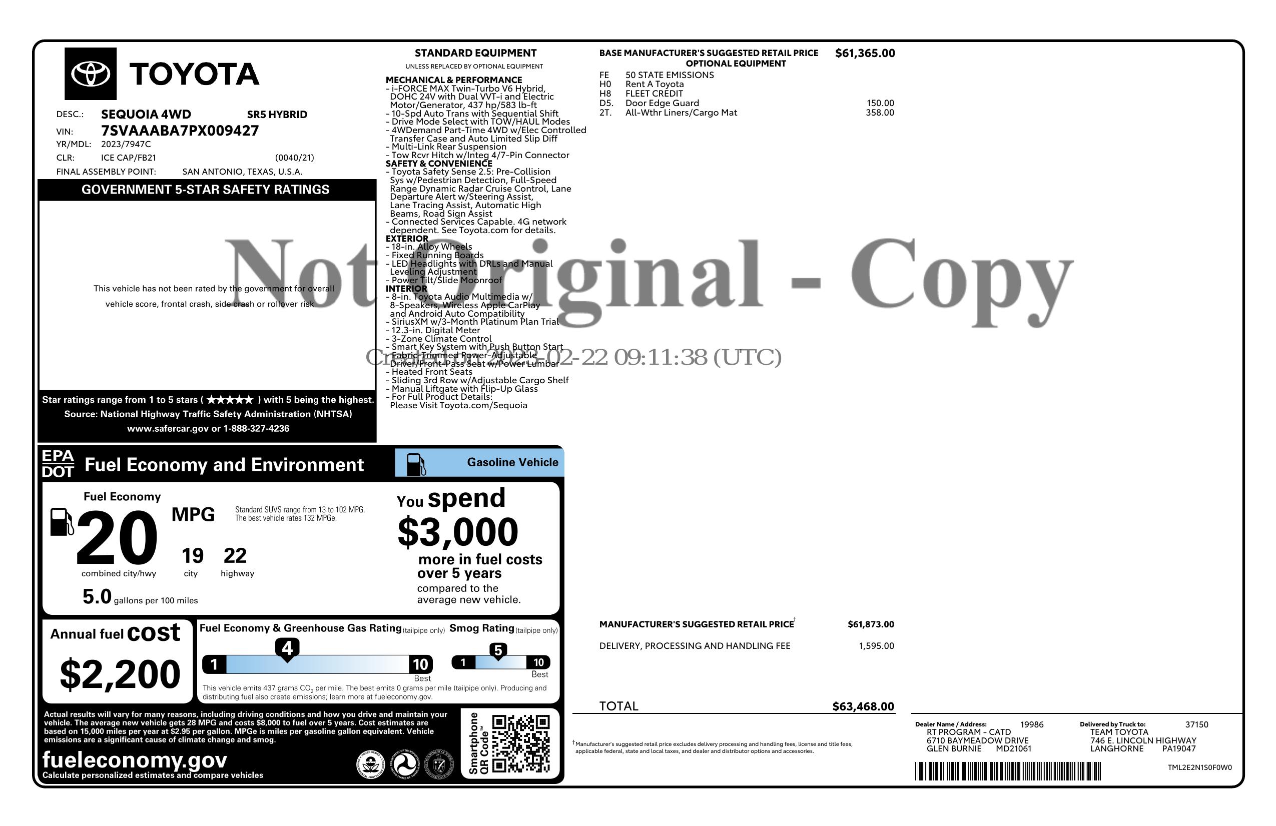 HYBRID SUV!!Now available at Morgan Automotive, this 2023 Toyota Sequoia SR5 Hybrid 4WD in clean Ice Cap delivers bold styling, powerful performance, and family-ready versatility. Its commanding exterior features Toyota’s signature grille, LED headlights and taillights, heated power side mirrors, and 18-inch alloy wheels for a rugged yet refined look. Inside, the spacious cabin offers seating for up to eight with premium cloth upholstery, power moonroof, a 8-inch touchscreen with wireless Apple CarPlay and Android Auto, tri-zone automatic climate control, multiple USB ports to keep everyone connected and 3rd row sliding seats. The i-FORCE MAX hybrid powertrain pairs seamlessly with 4WD and a selectable drive mode system for impressive capability both on and off the road. Safety is a top priority with Toyota Safety Sense 2.5, including Pre-Collision System with Pedestrian Detection, Lane Departure Alert with Steering Assist, Full-Speed Range Dynamic Radar Cruise Control, and Road Sign Assist. Rugged, efficient, and versatile, this Sequoia SR5 Hybrid is ready for every adventure. Vehicle was just fully serviced including fresh inspection, fresh oil along with our multi point check sheet. Vehicle is covered under the remaining balance of factory warranty. *Price may have changed. Please visit our website for most up to date price.* ALL VEHICLES COME WITH THE “MORGAN PROMISE” MEANING ALL VEHICLES THAT WE SELL WILL HAVE AT LEAST 50% TIRE LIFE, 50% BRAKE LIFE, AND A WARRANTY APPLIED. ALL WARRANTIES CAN BE UPGRADED THROUGH PROGUARD AT TIME OF PURCHASE. FOR MORE INFORMATION PLEASE CONTACT OUR COMMISSION FREE SALES TEAM TODAY AT SALES@MORGANAUTOMOTIVE.BIZ OR BY CALLING 717-664-3833